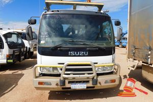 2007 Isuzu FRR550 Tray Top, White, 4 x 2, Auto, 6 Cylinder Diesel, Reg #: KBC12936 (Expiry - 20/12/2026) ODO: 98,363 Showing on Clock Eng #: 6HK1451372, VIN: JALFRR34M67000797 Features: Bullbar, Tow Bar & Ball, ROP Canopy, Service Lights, Two Way & Aerial, 2.2T Hiab Crane with Tray Jack Stands, (Asset # KO19), (Disp# 015573487), (DR#6429*) Condition: (General Wear & Tear, Body Tray Undercarriage, Rust Scrapes & Pitting, Holed In Exhaust System, Cracked in Cab Console, Air Leak Brake System), Panel: FAIR, Paint: FAIR, Glass: FAIR, Tyres: FAIR Dash: FAIR, Upholstery: FAIR, Floor: FAIR, Overall Condition: FAIR